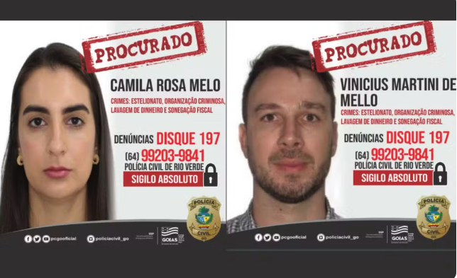 A Polícia Civil de Goiás revelou um esquema milionário de fraudes envolvendo o corretor de grãos Vinicius Martini de Mello e sua esposa, Camila Rosa Melo. O casal é acusado de estelionato, organização criminosa, lavagem de dinheiro e sonegação fiscal, com prejuízos estimados em bilhões de reais. Ambos estão foragidos, com indícios de que tenham fugido para os Estados Unidos. Seus nomes foram incluídos na lista de procurados da Interpol.
